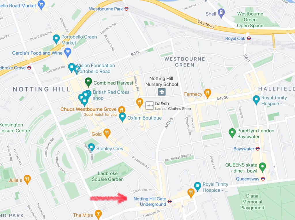 I’d suggest starting at Notting Hill Gate which has a tube station that’s on the Central, Circle and District lines. It’s also a bus hub so hopefully it doesn’t take you more than the seemingly unavoidable ‘London40’ minutes to get to.
