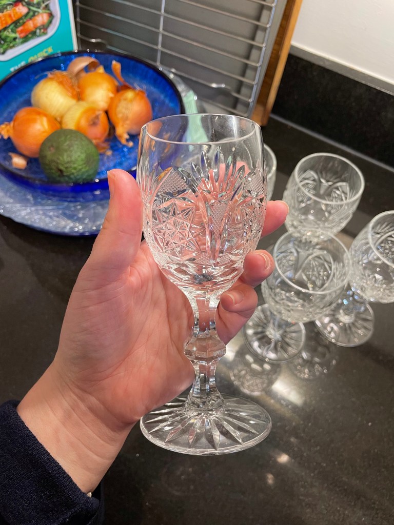 x5 of these beautiful cut crystal?/glass? wine glasses for £20 meant I had to grab them.